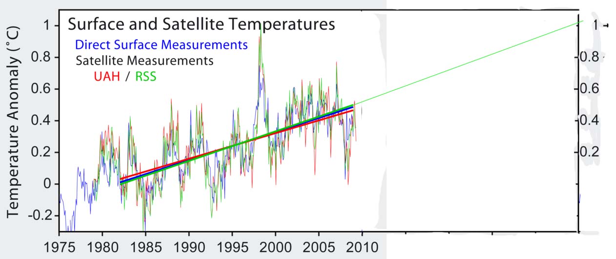 http://en.wikipedia.org/wiki/Satellite_temperature_measurements What Determines Earth’s Climate? 1999-2012 flattening temperaturesOVER the past few years one of the biggest questions in climate science has been why, since the turn of the century, average surface-air temperatures on Earth have not risen, even though the concentration in the atmosphere of heat-trapping carbon dioxide has continued to go up. This “pause” in global warming has been seized on by those sceptical that humanity needs to act to curb greenhouse-gas emissions or even (in the case of some extreme sceptics) who think that man-made global warming itself is a fantasy. People with a grasp of the law of conservation of energy are, however, sceptical in their turn of these positions and doubt that the pause is such good news. They would rather understand where the missing heat has gone, and why—and thus whether the pause can be expected to continue. The most likely explanation is that it is hiding in the oceans, which store nine times as much of the sun’s heat as do the atmosphere and land combined. But until this week, descriptions of how the sea might do this have largely come from computer models. Now, thanks to a study published in Science by Chen Xianyao of the Ocean University of China, Qingdao, and Ka-Kit Tung of the University of Washington, Seattle, there are data. Dr Chen and Dr Tung have shown where exactly in the sea the missing heat is lurking. As the chart below shows, over the past decade and a bit the ocean depths have been warming faster than the surface. This period corresponds perfectly with the pause, and contrasts with the last two decades of the 20th century, when the surface was warming faster than the deep. The authors calculate that, between 1999 and 2012, 69 zettajoules of heat (that is, 69 x 1021 joules—a huge amount of energy) have been sequestered in the oceans between 300 metres and 1,500 metres down. If it had not been so sequestered, they think, there would have been no pause in warming at the surface. Hidden depthsThe two researchers draw this conclusion from observations collected by 3,000 floats launched by Argo, an international scientific collaboration. These measure the temperature and salinity of the top 2,000 metres of the world’s oceans. In general, their readings match the models’ predictions. But one of the specifics is weird. Most workers in the field have assumed the Pacific Ocean would